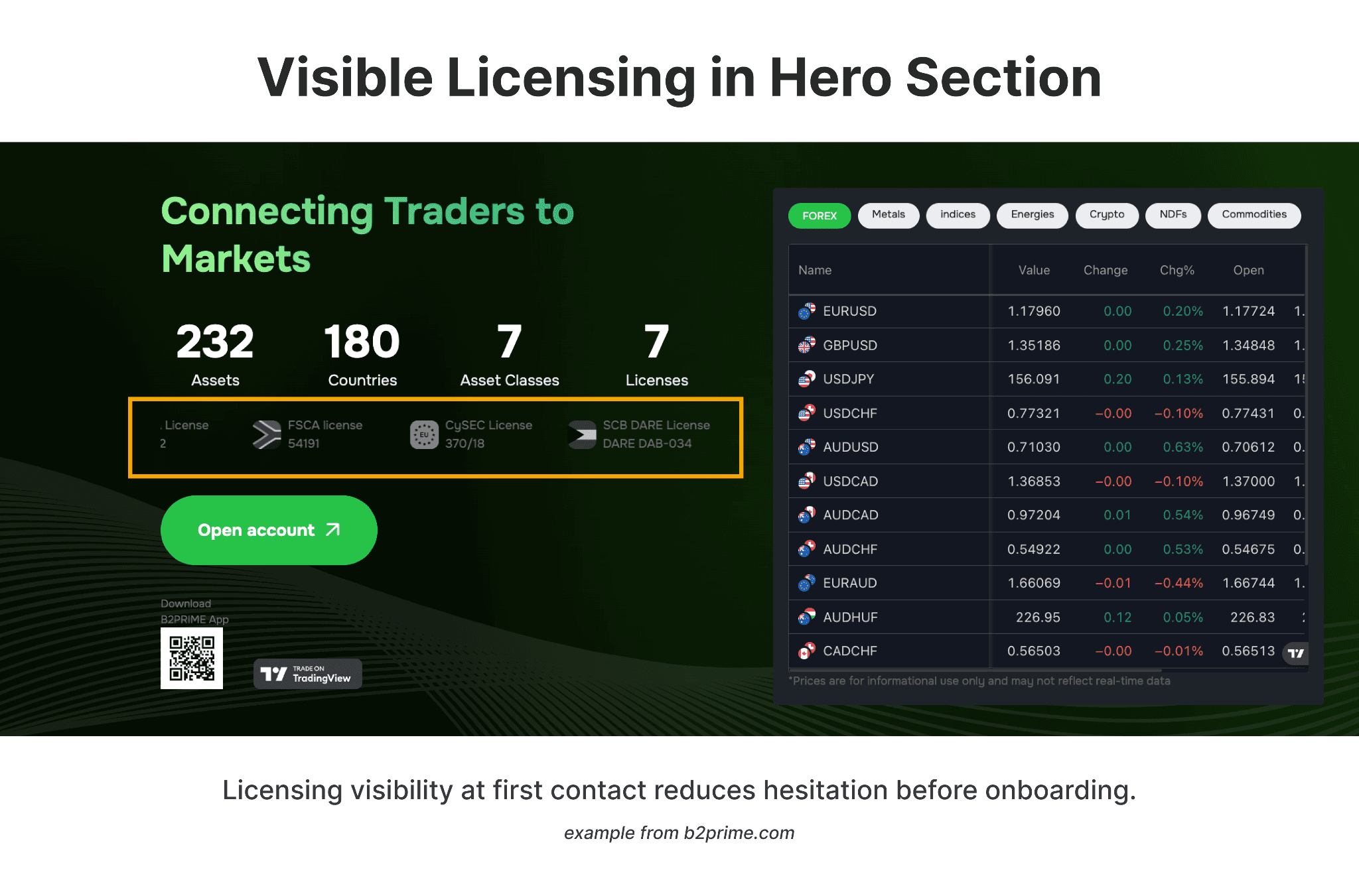 Real-world example: B2PRIME displays all seven active licenses — CySEC, DFSA, FSC, SFSA, FSCA and others — directly in the hero section of the homepage, with each number visible and verifiable on the spot. Mercury takes the same principle into the onboarding flow, explaining FDIC coverage, encryption standards, and fraud monitoring before asking users to connect financial accounts. Both reduce hesitation exactly where the trust decision is made.